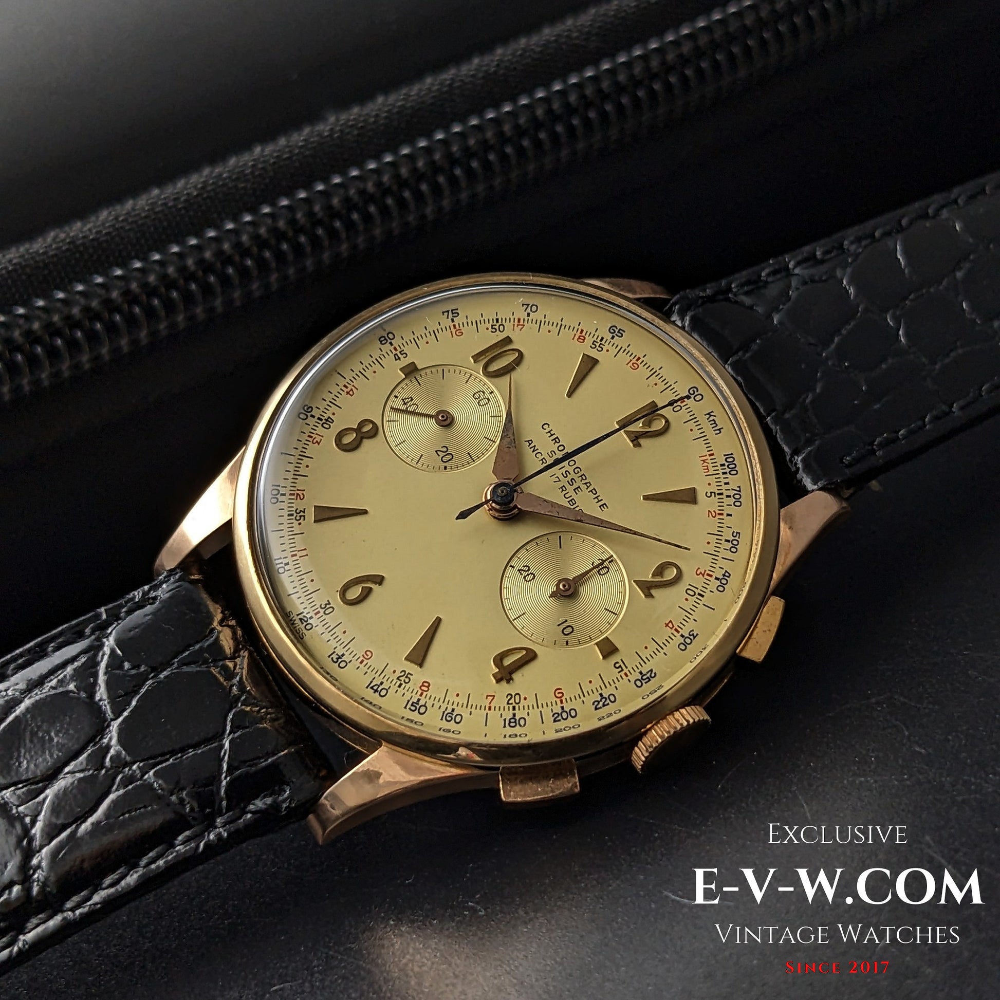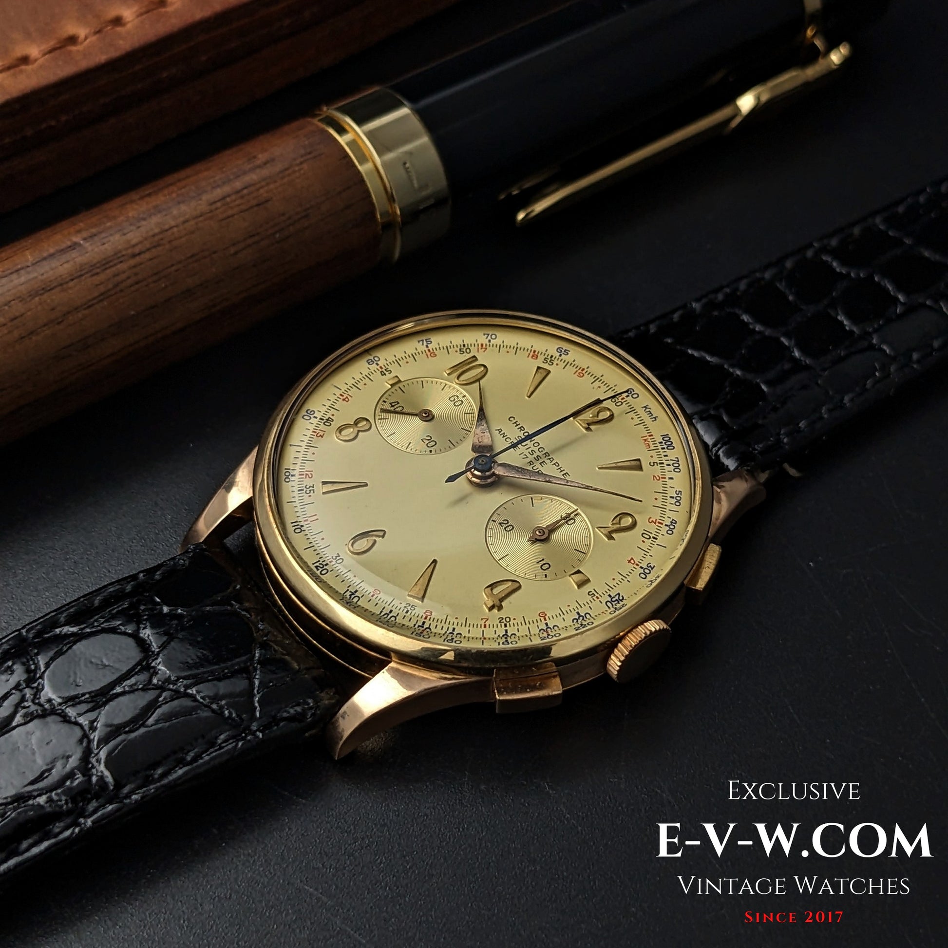 The Landeron 51 in this piece descends from 1937’s Landeron 47—the first industrial cam-switched chronograph movement that helped spark the post-war “Chronographe Suisse” boom. Available in our shop. Typical Chronographe Suisse hallmarks and Landeron 51 architecture place this example in the 1950s; consistent with mid-century oversized gold cases and twin-cover construction.