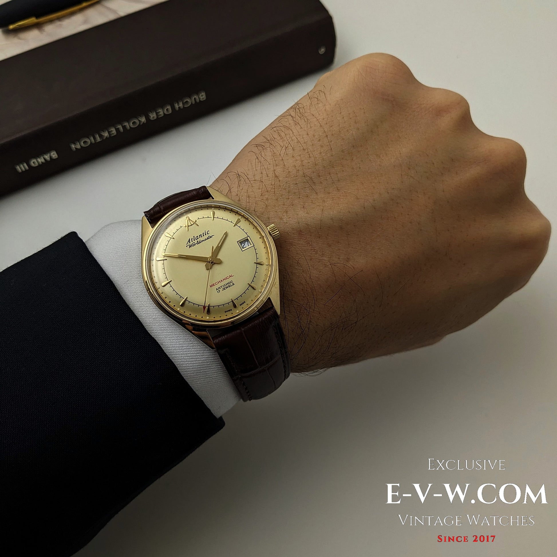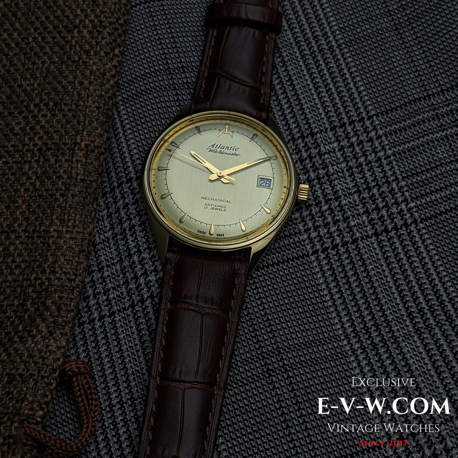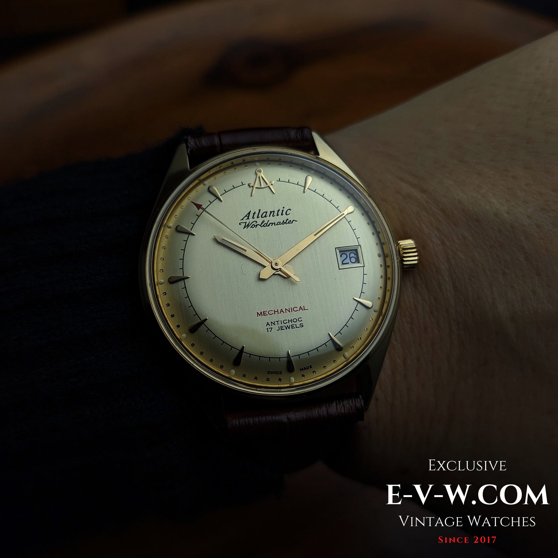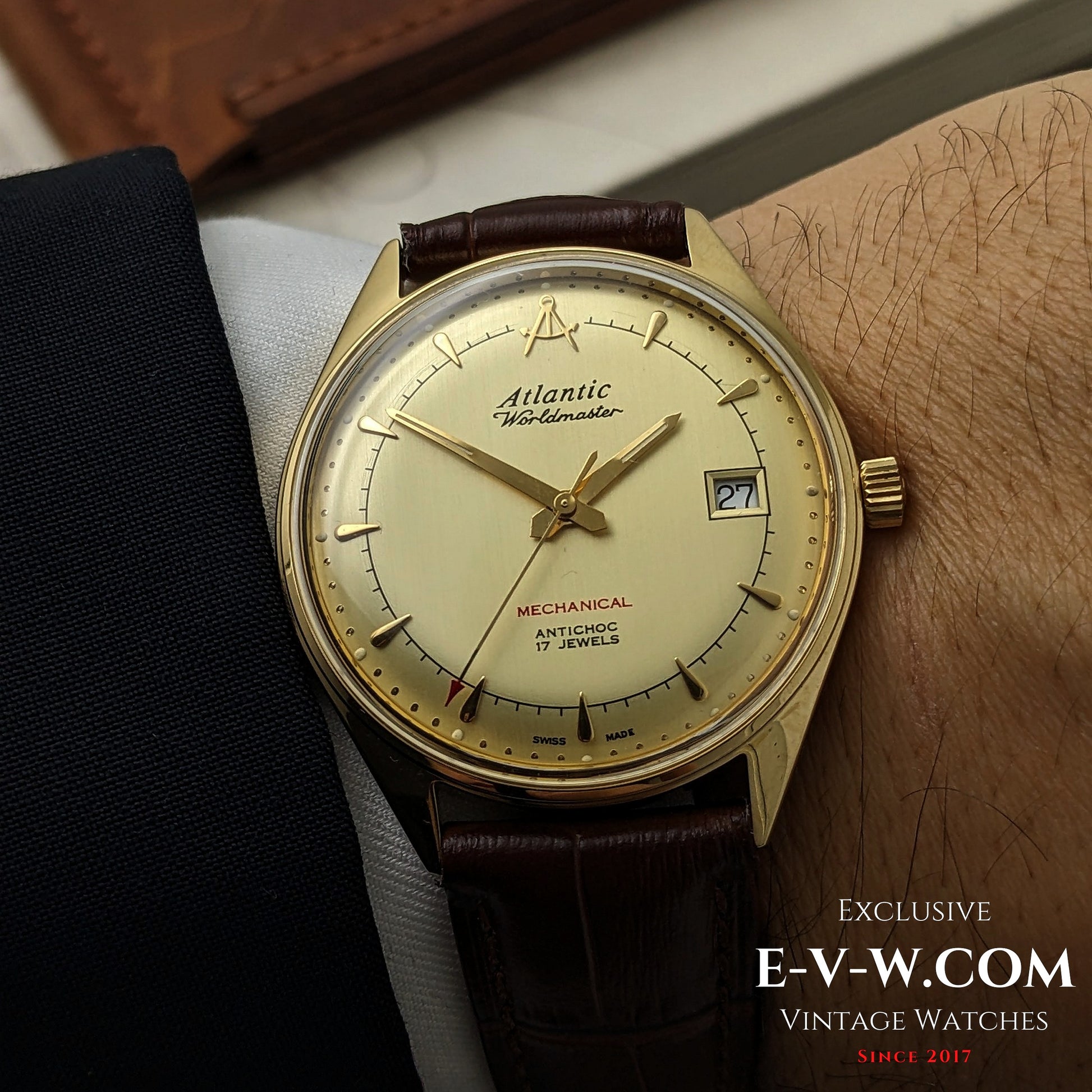 The Atlantic Worldmaster with hand-wound caliber 969-4M fits the 1960s production period, which matches the dial layout, logo style and gold-plated case proportions seen here.