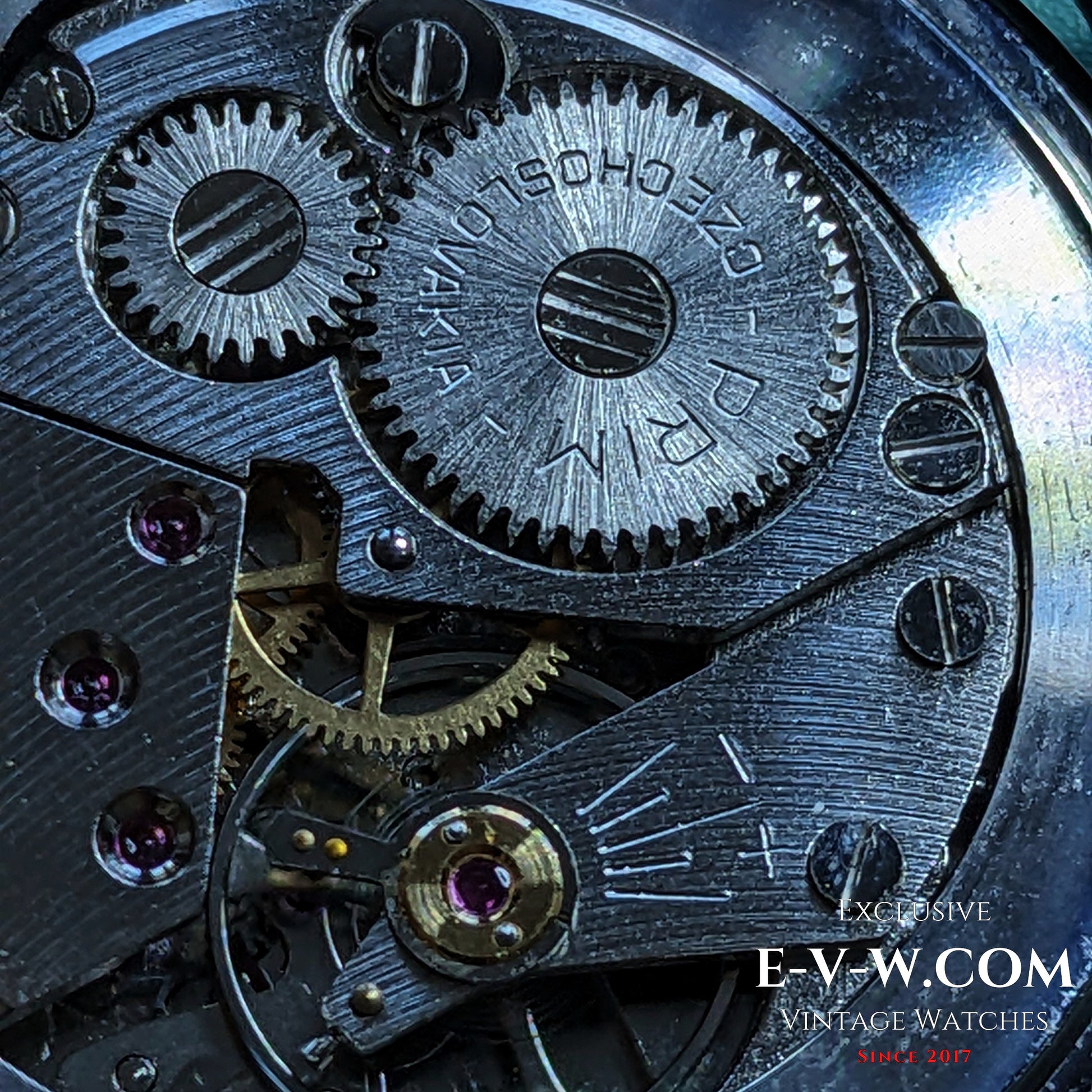 Dial: Silver center with pink chapter ring; gilt markers/hands; “CZECHOSLOVAKIA”