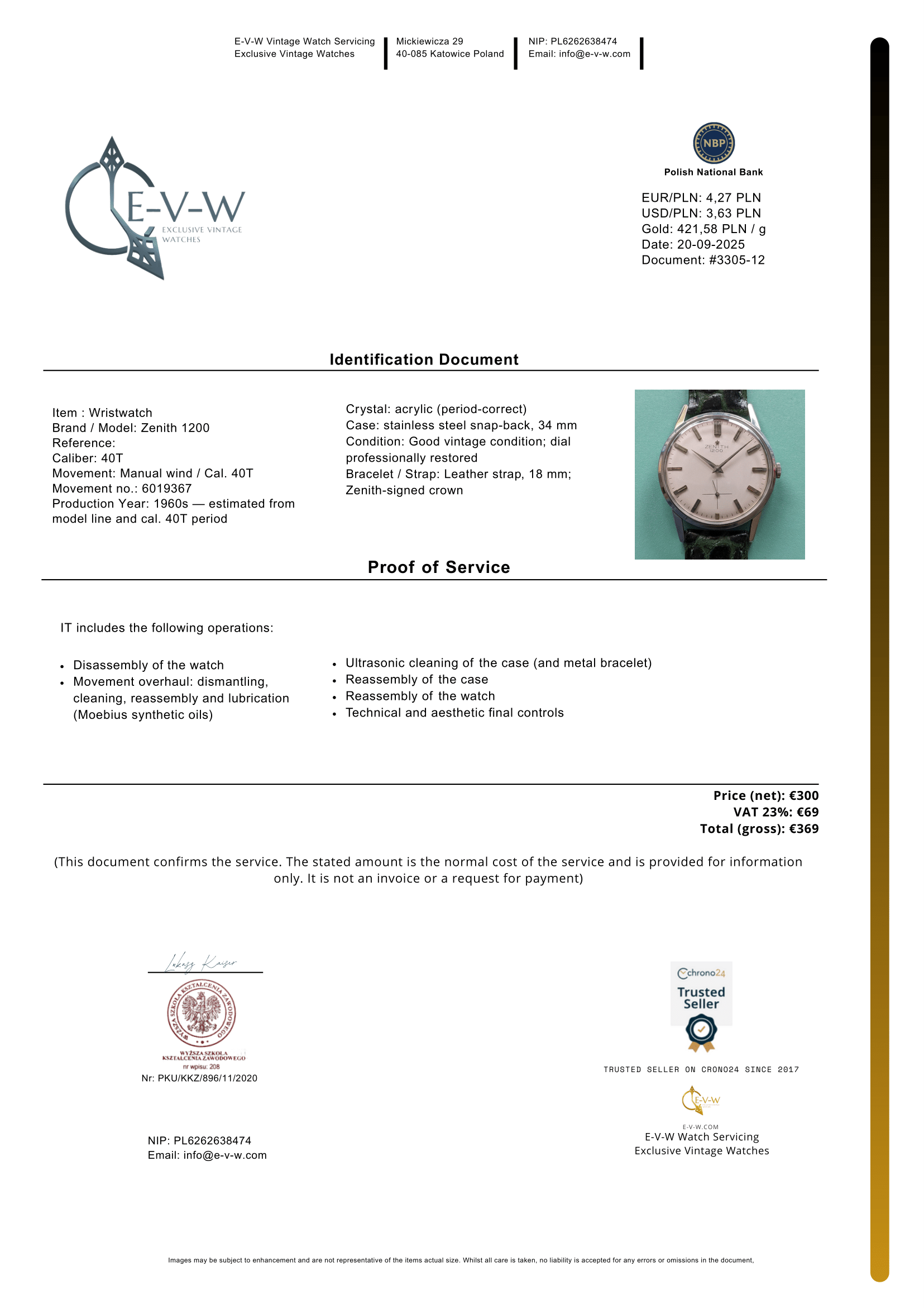 Documents: Invoice and our service certificate worth €369 — included free of charge