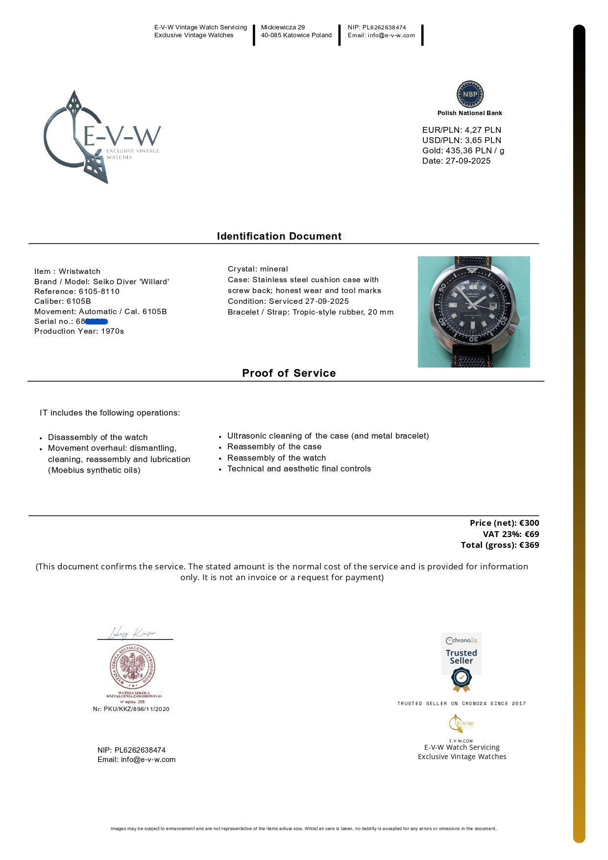 Inside beats Seiko’s in-house automatic Cal. 6105B (date, hacking), a 17-jewel workhorse running at ~21,600 vph. The movement has just been fully serviced on 27.09.2025; timing, regulation, lubrication, and final QC were completed, and a service certificate is included.