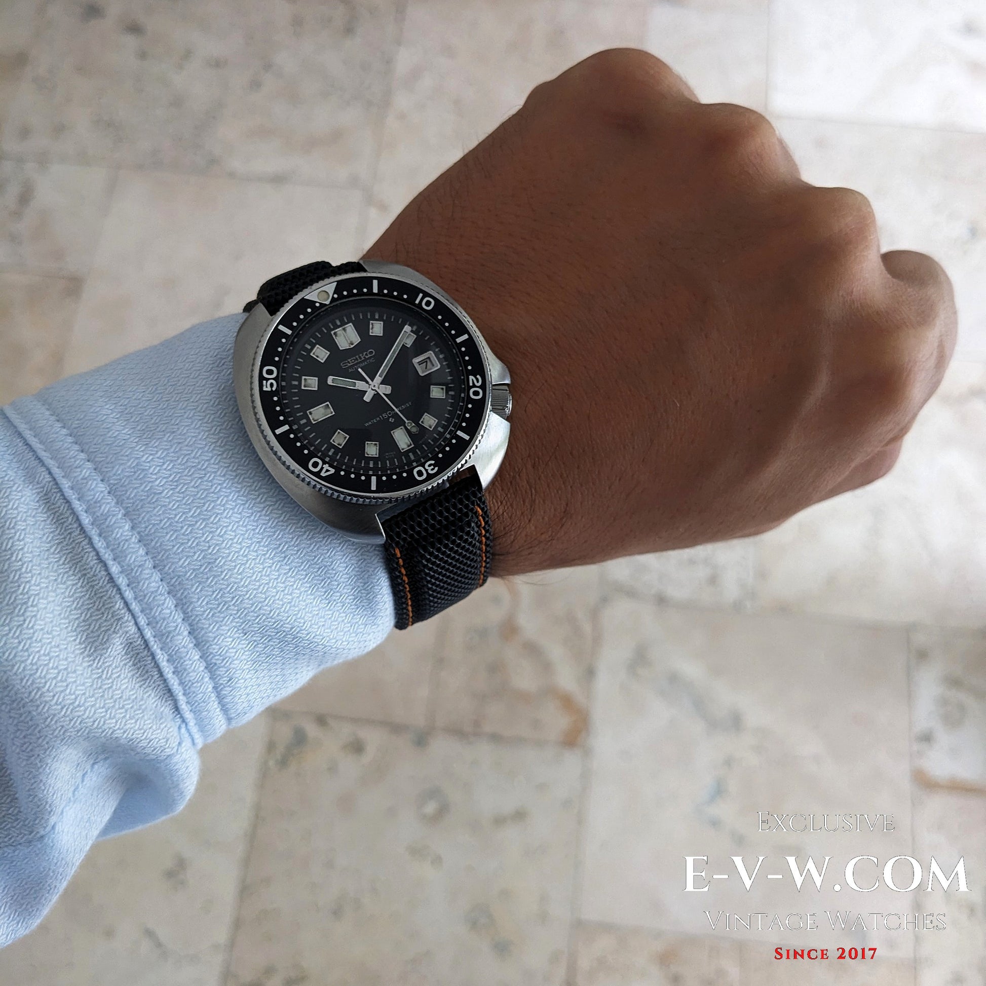 The watch wears beautifully thanks to the rounded cushion profile: ~43 mm case (ex-crown) and 20 mm lugs. It is fitted with a tropic-style rubber strap for a period look. The crystal is mineral (Seiko Hardlex type), the dial/original handset present a clean, tool-watch character, and the rotating bezel adds the right vintage diver energy. Water resistance is not guaranteed on vintage pieces, so treat as splash-resistant only.