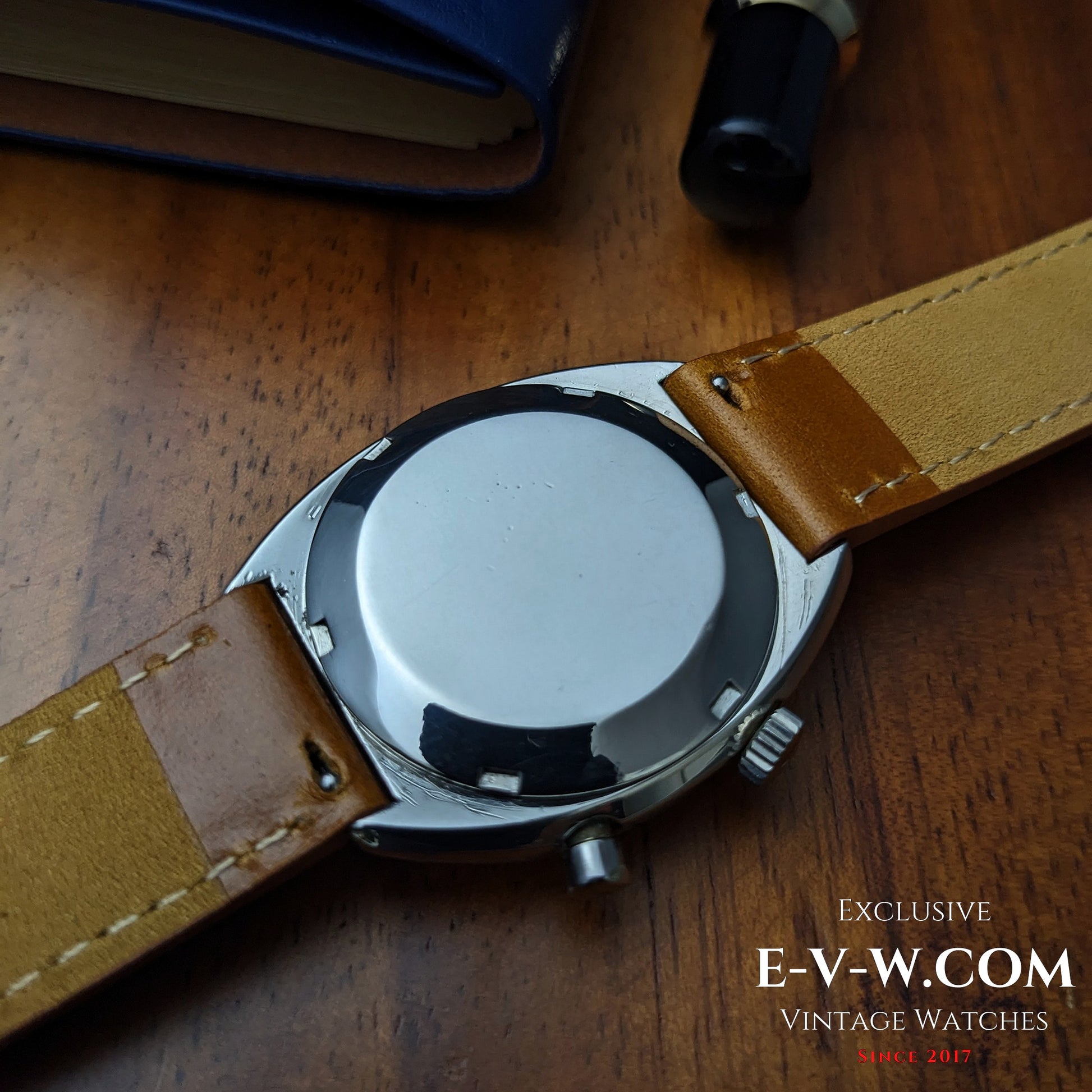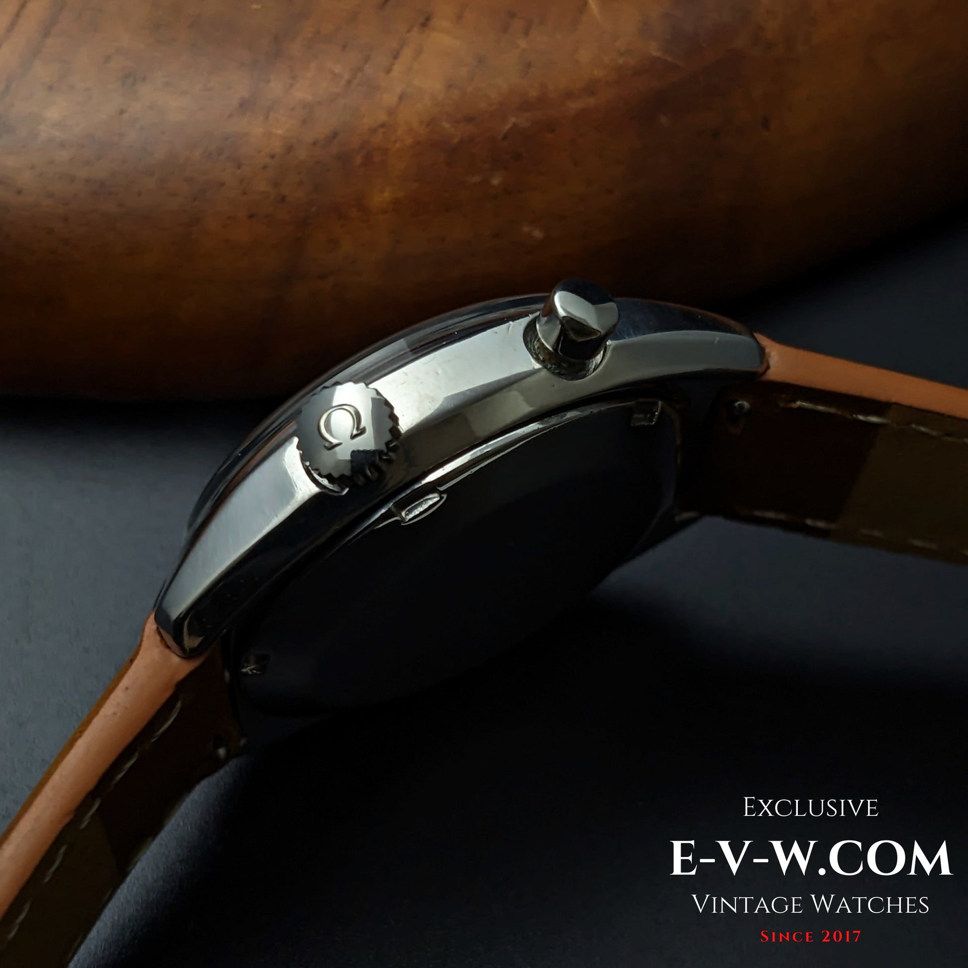 This 59 years old Omega Chronostop Genève was born in the late ’60s for motorists and sports fans, Omega’s Chronostop used a press-and-hold single pusher to time 60-second checksovertakes, lap splits, parking meters—with a special “Driver” variant rotated for reading on the wheel. Inside caseback marked 146.009/146.010; Cal. 920 was produced for the Chronostop line in the late 1960s. Original signed crown and blue dial present. Fresh service 25-07-2025 with certificate #3303-25; full movement number provided in buyer’s documents if required.