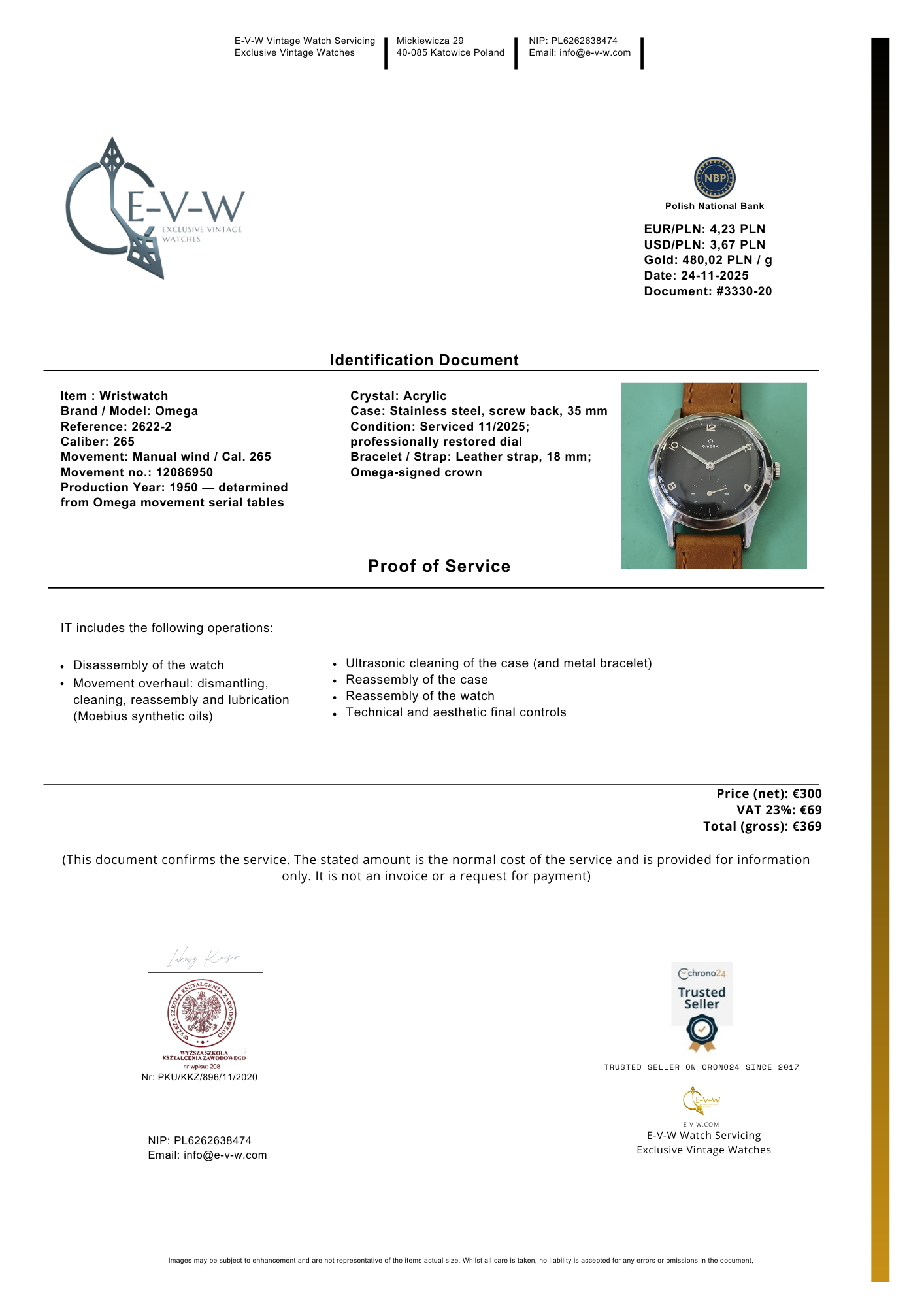 Documents: Invoice and our service certificate worth €369 — included free of charge