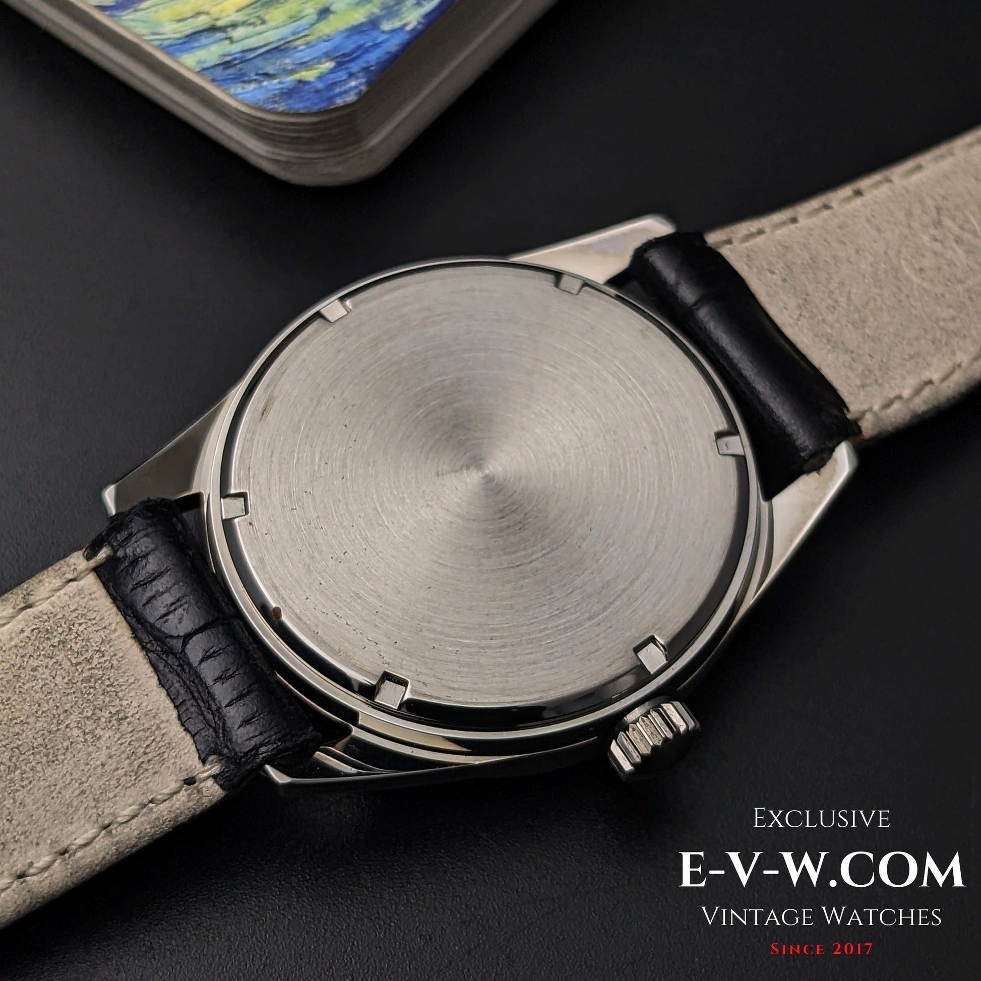 Cal. 684 (movement stamped 68.4), sector dial and faceted bezel place it in the early 1970s; no public serial used on this model. Period-correct acrylic crystal and 34 mm steel snap-back case support the timeframe.