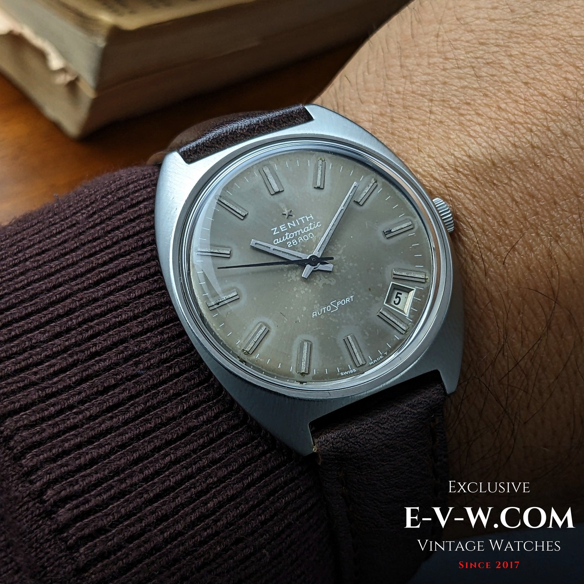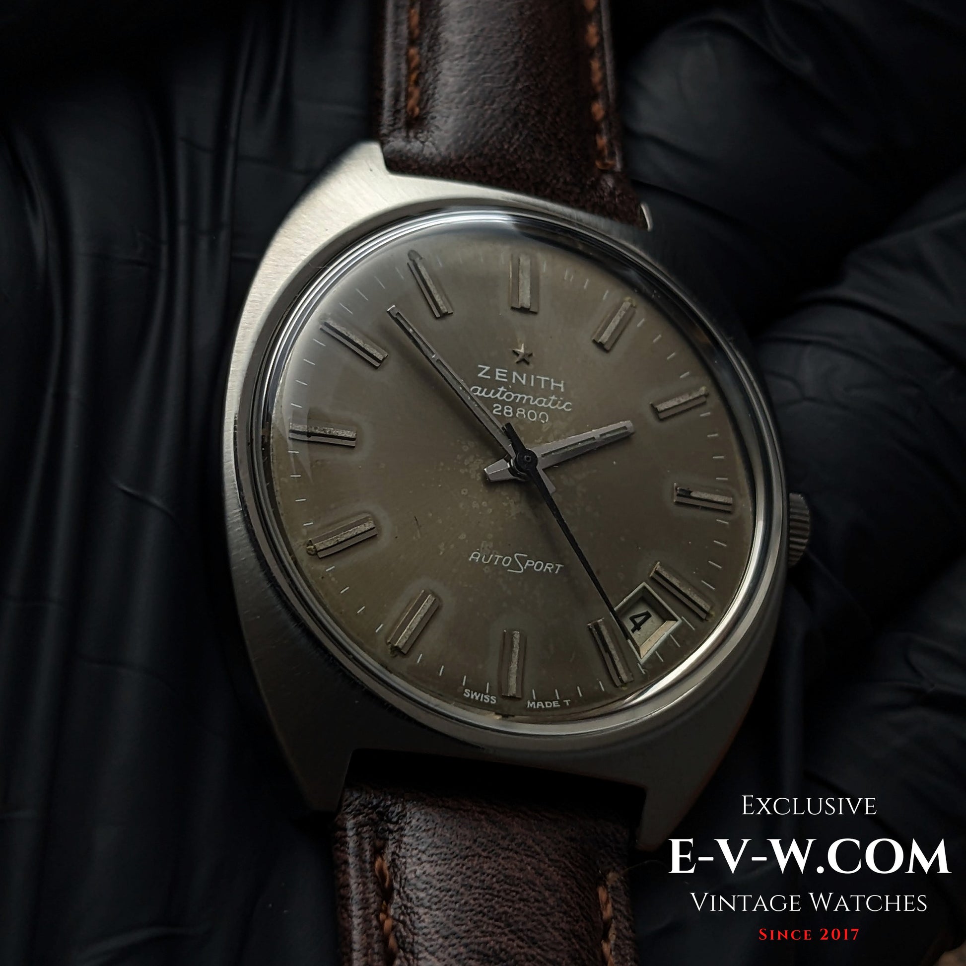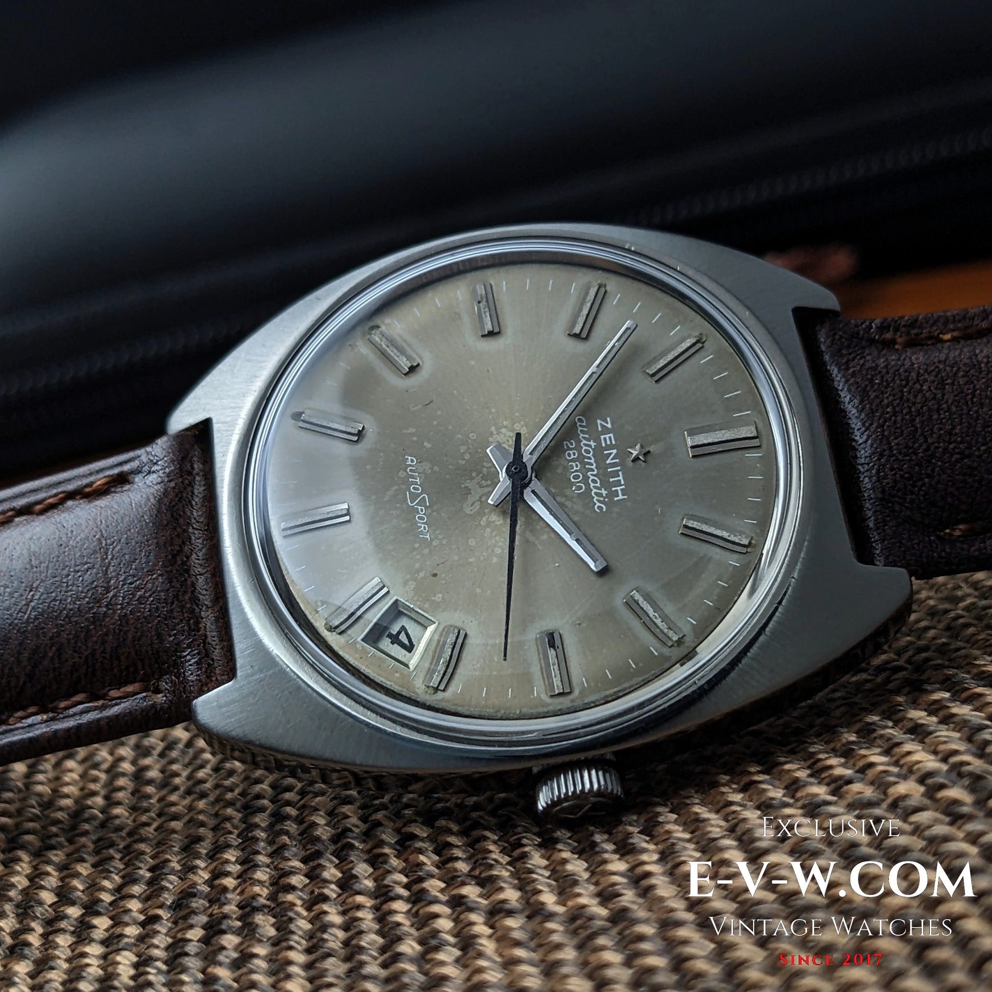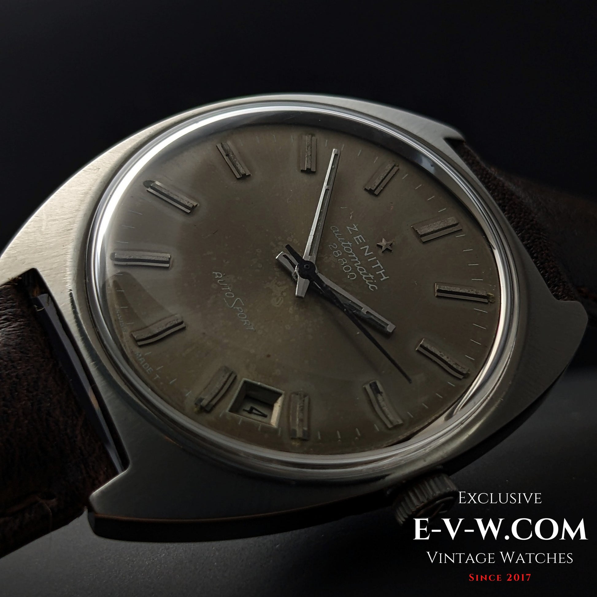 A sharp, cushion-case Zenith AutoSport with the desirable “AUTOMATIC 28800” dial text—an early-’70s tell—paired to Zenith’s hi-beat cal. 2562PC. The silver sunburst dial shows attractive, even patina with applied baton markers, faceted hands, and a date neatly tucked at ~4:30. Original Zenith-signed crown present. Inside caseback is stamped GR 720001; external case serial ends …94 (full number in buyer documents).