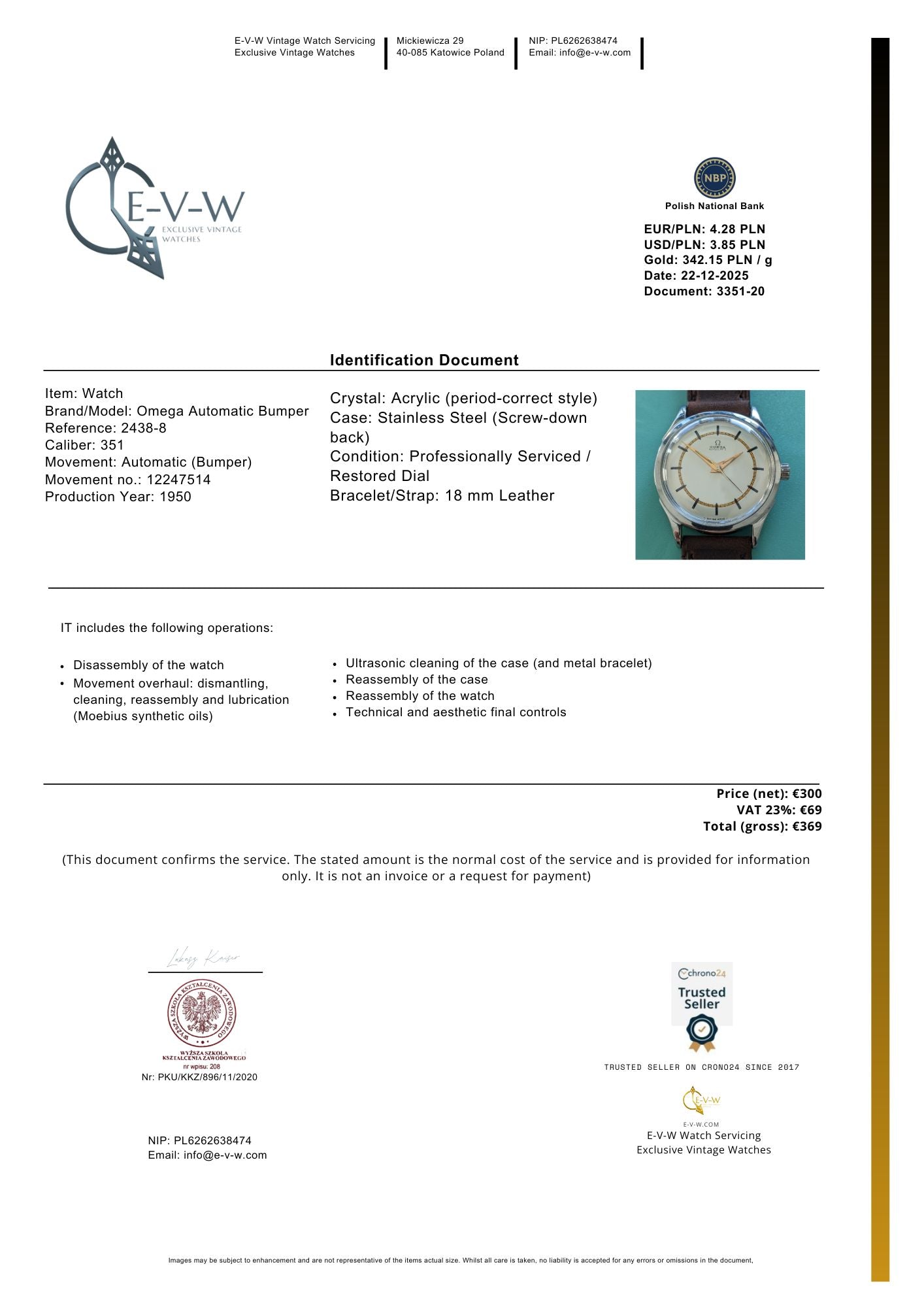 Documents: Invoice and our service certificate worth €369 — included free of charge