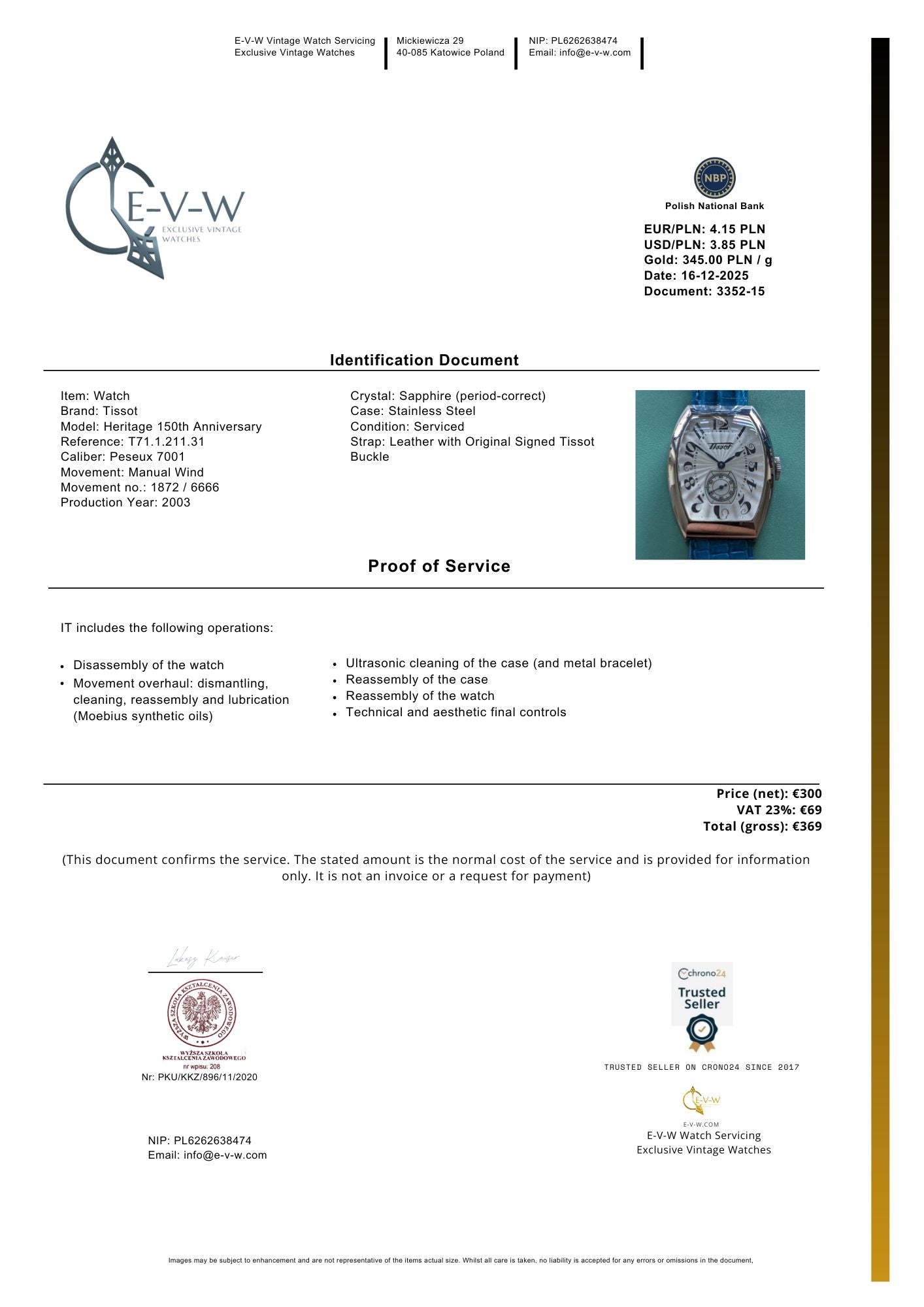 Documents: Invoice and our service certificate worth €369 — included free of charge