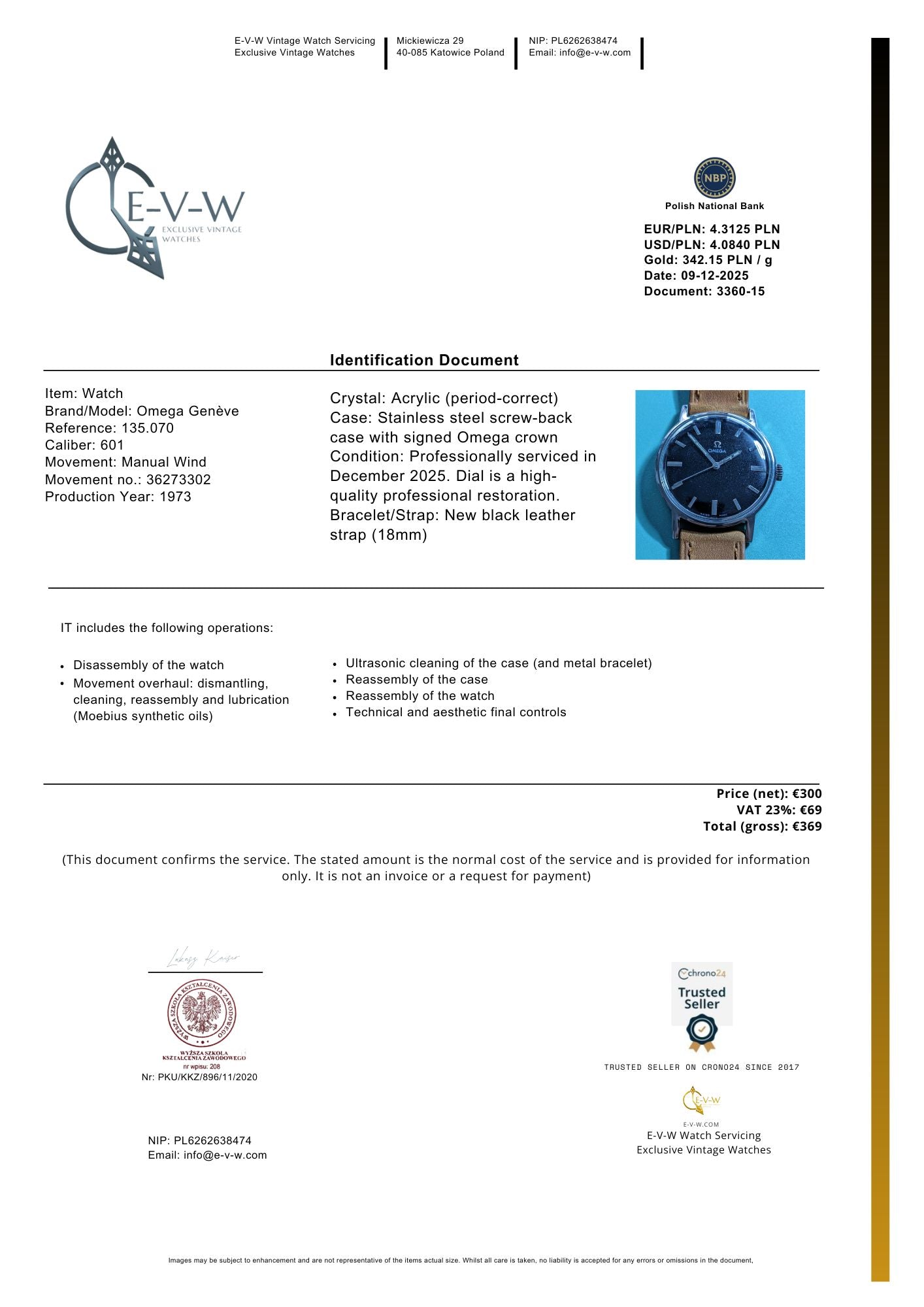 Documents: Invoice and our service certificate worth €369 — included free of charge