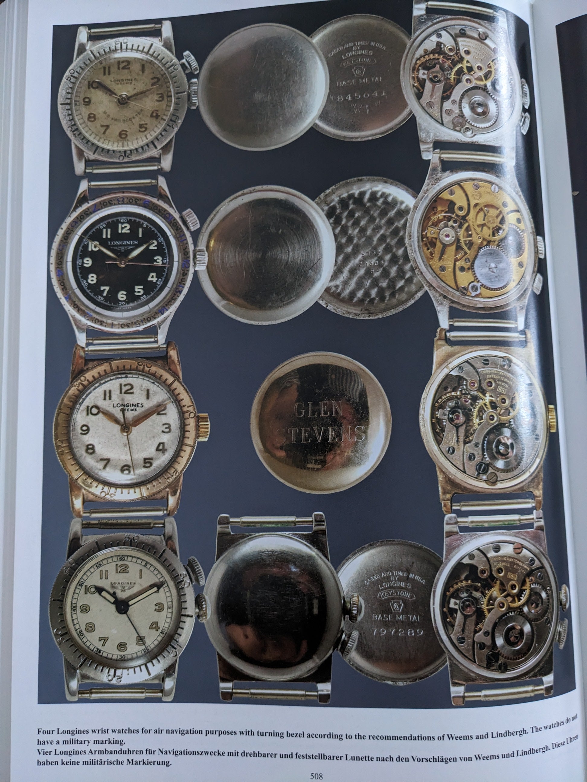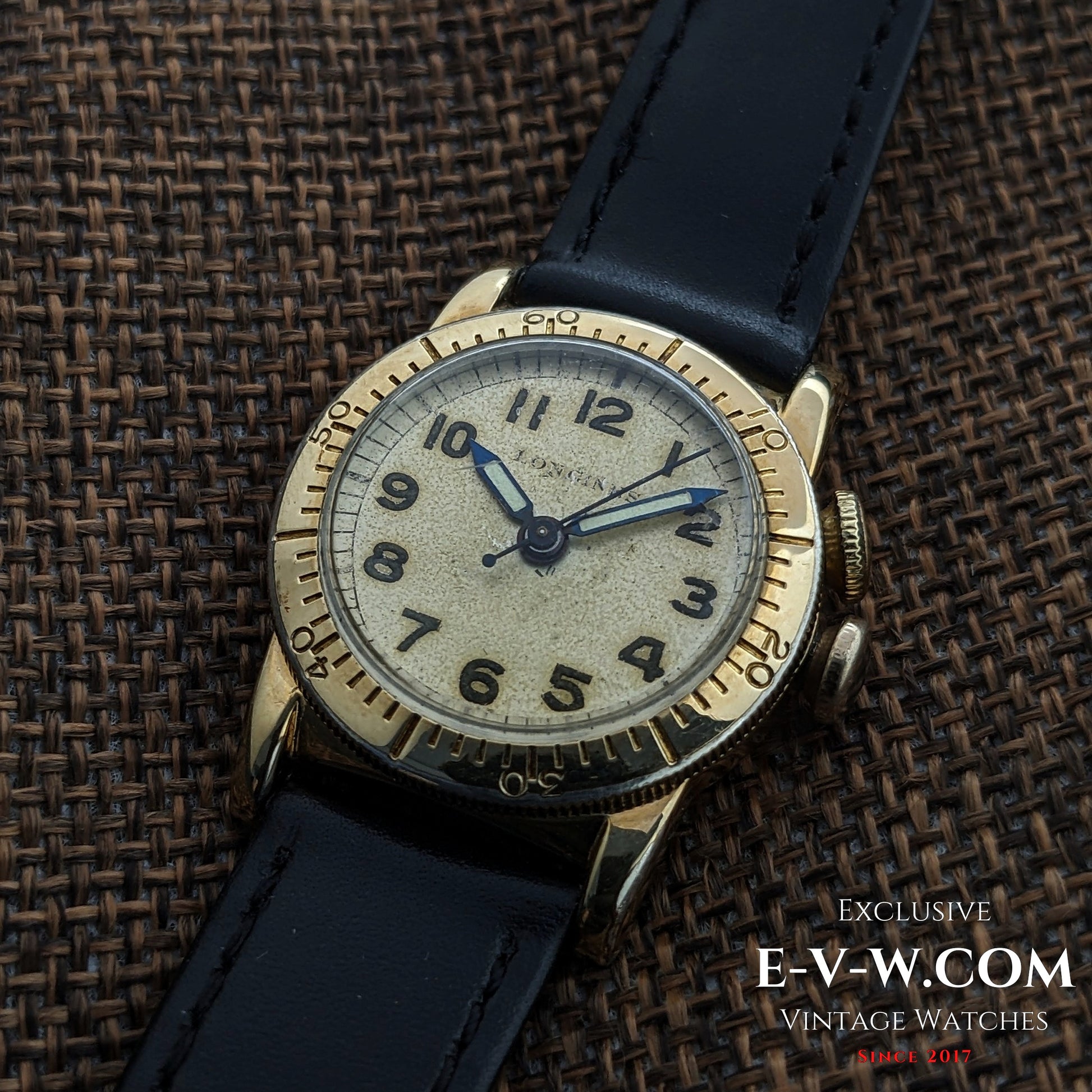 This paricular model was cased and timed in the USA to Weems and Lindbergh’s pilot’s watch built around Philip Van Horn Weems’ U.S.-patented rotating bezelsecond-setting” system—one of the earliest wristwatches created to help aviators sync precisely to radio time. Available in our shop. A mobilization-era design with dual crowns, rotating minutes bezel and clear Arabic numeralsexactly the kind of practical tool watch Longines delivered for the U.S. market in the 1940s. Dating is based on the Longines cal. 10L movement number in the mid-6.7m range and the U.S.-made AG 10K gold-filled case signed 'Cased and Timed in U.S.A. by Longines.'