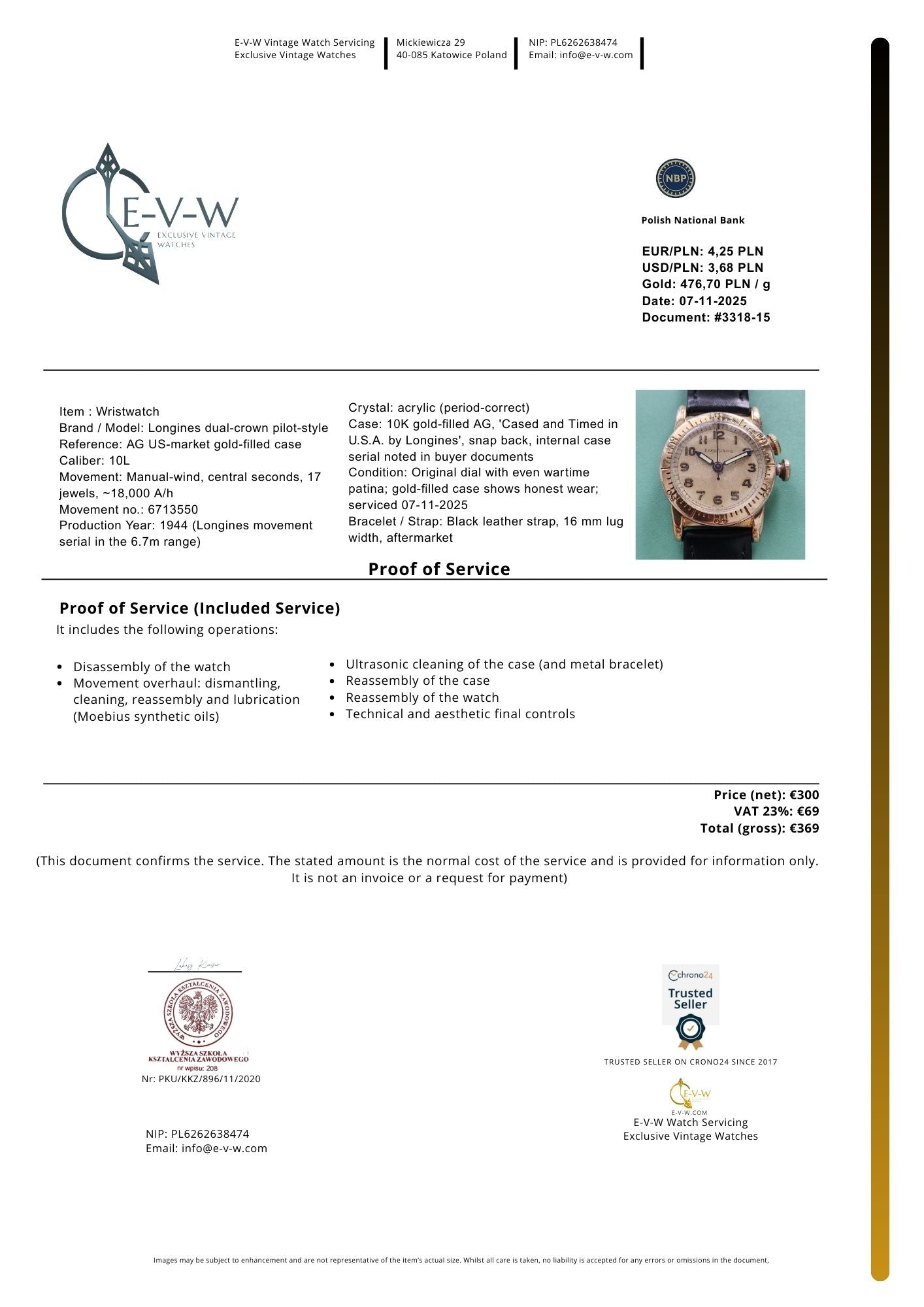 Documents: Invoice and our service certificate worth €369 — included free of charge
