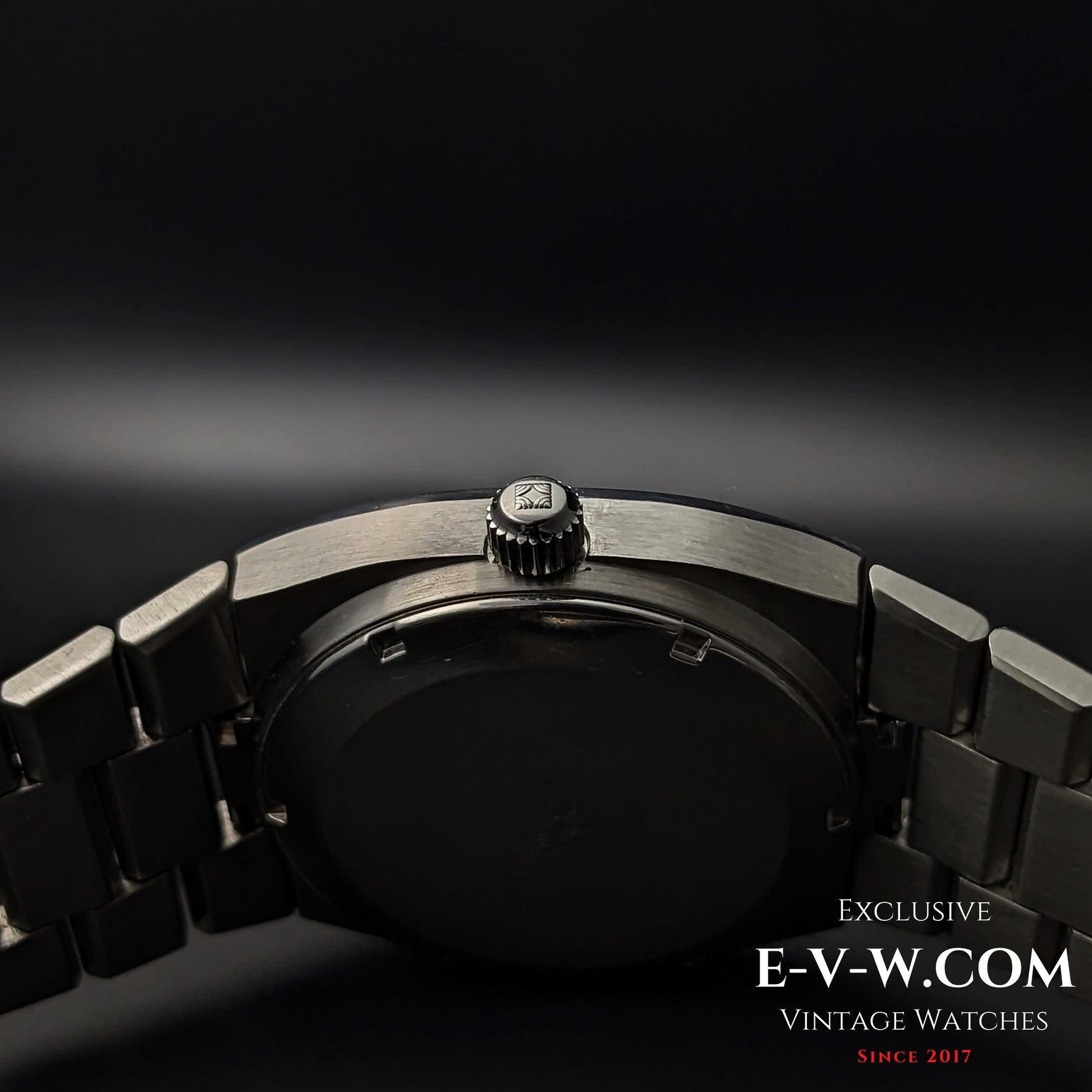 Case: Stainless steel (acier inoxidable), angular 1970s shape.