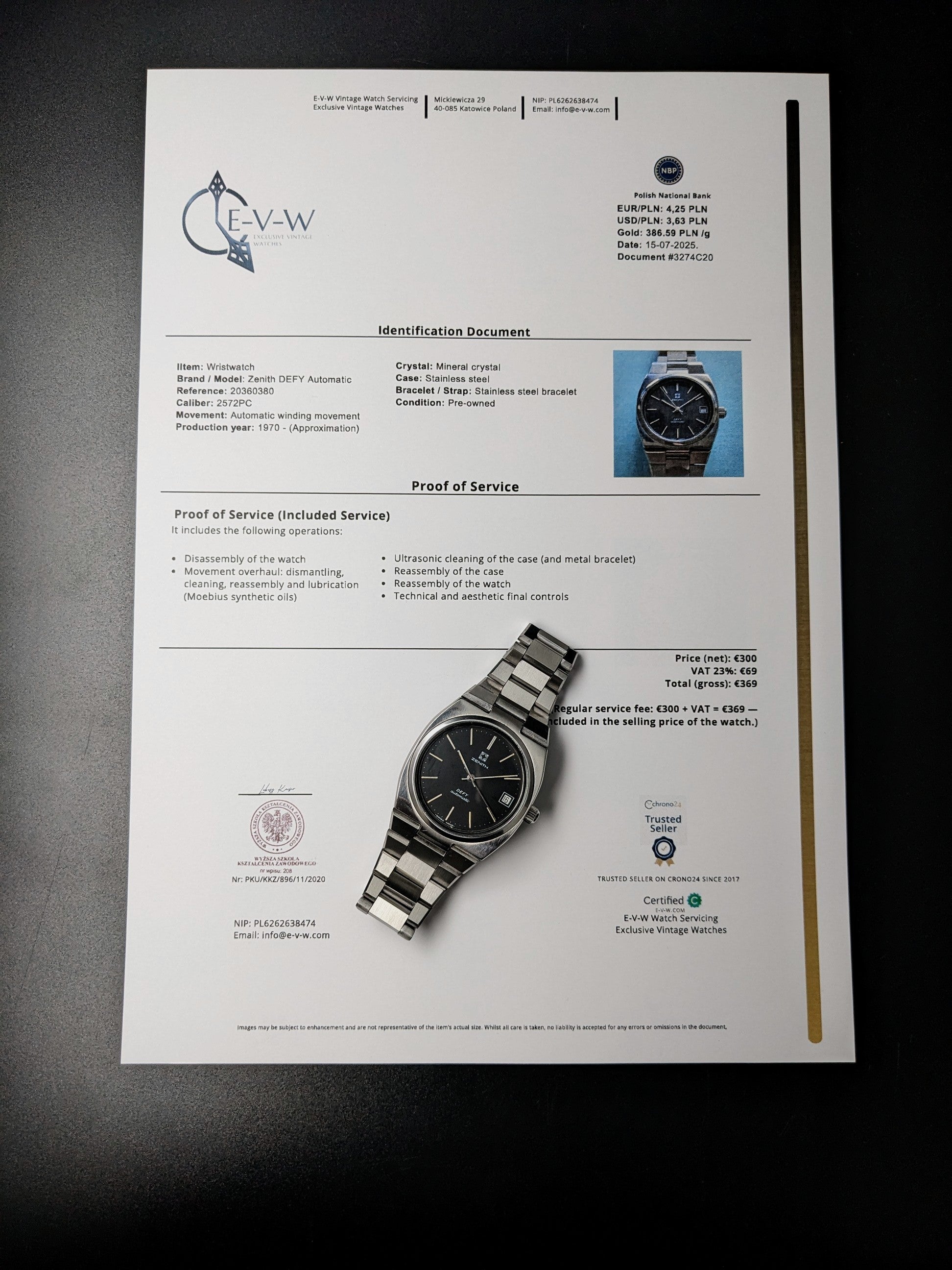 Documents: Invoice and our service certificate worth €369 — included free of charge